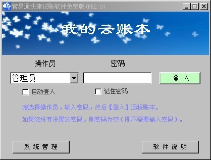 3.新建的賬本,默認操作員名稱(chēng)為“管理員”,不需要輸入密碼,直接點(diǎn)擊【登入】。
