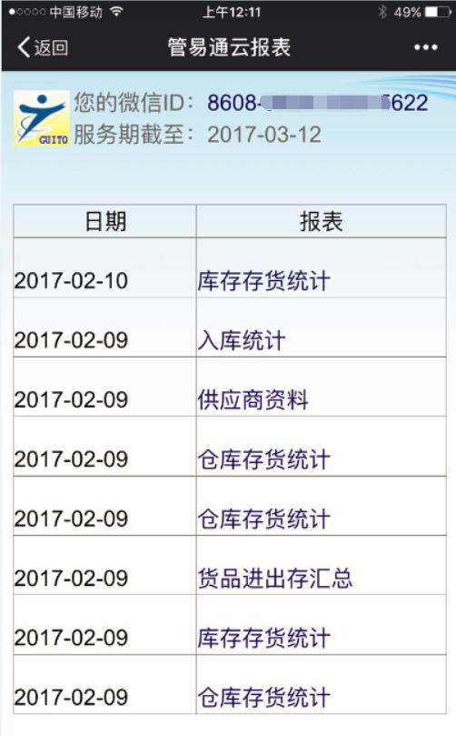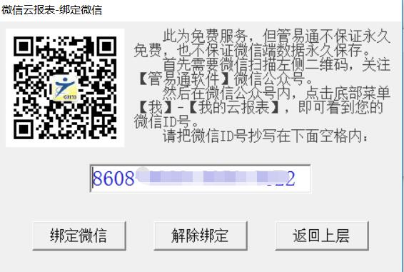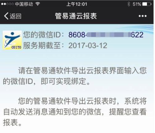 在上面的畫(huà)面中,查看到您的微信ID,這是管易通為您分配的獨一無(wú)二的序列號,將用于云報表綁定此微信。