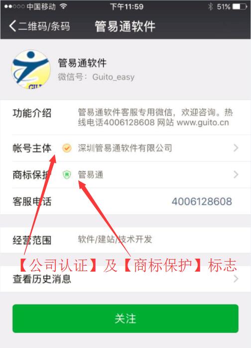 《管易通云報表升級版》也稱(chēng)為“微信云報表”,即可以在微信上方便的接收、查看管易通軟件輸出的報表。 使用《管易通云報表升級版》首先需要您關(guān)注“管易通軟件”微信公眾號。